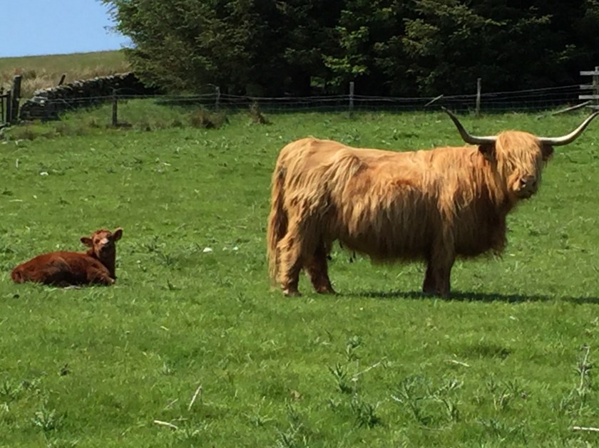 Today were glad to leave the canals behind us and get into the Pentland Hills. Our route now heads broadly south east for the next few days and will see us leave Scotland and join the Pennine Way at Byrness in Northumberland. We should be crossing the border on Thursday. Our route uses the Cross Border Drovers Trail and St. Cuthbert’s Way and takes us through Peebles and Jedburgh. The Cross Borders Drovers Trail was the route cattle were taken from the borders to Peebles and beyond for sale. The route is also known as the Thieves Way as thieves would often ambush the drovers to steal their cattle. The terrain is similar to Dartmoor so we felt at home and it was good to be heading south again after our zig east from Glasgow to Edinburgh.
