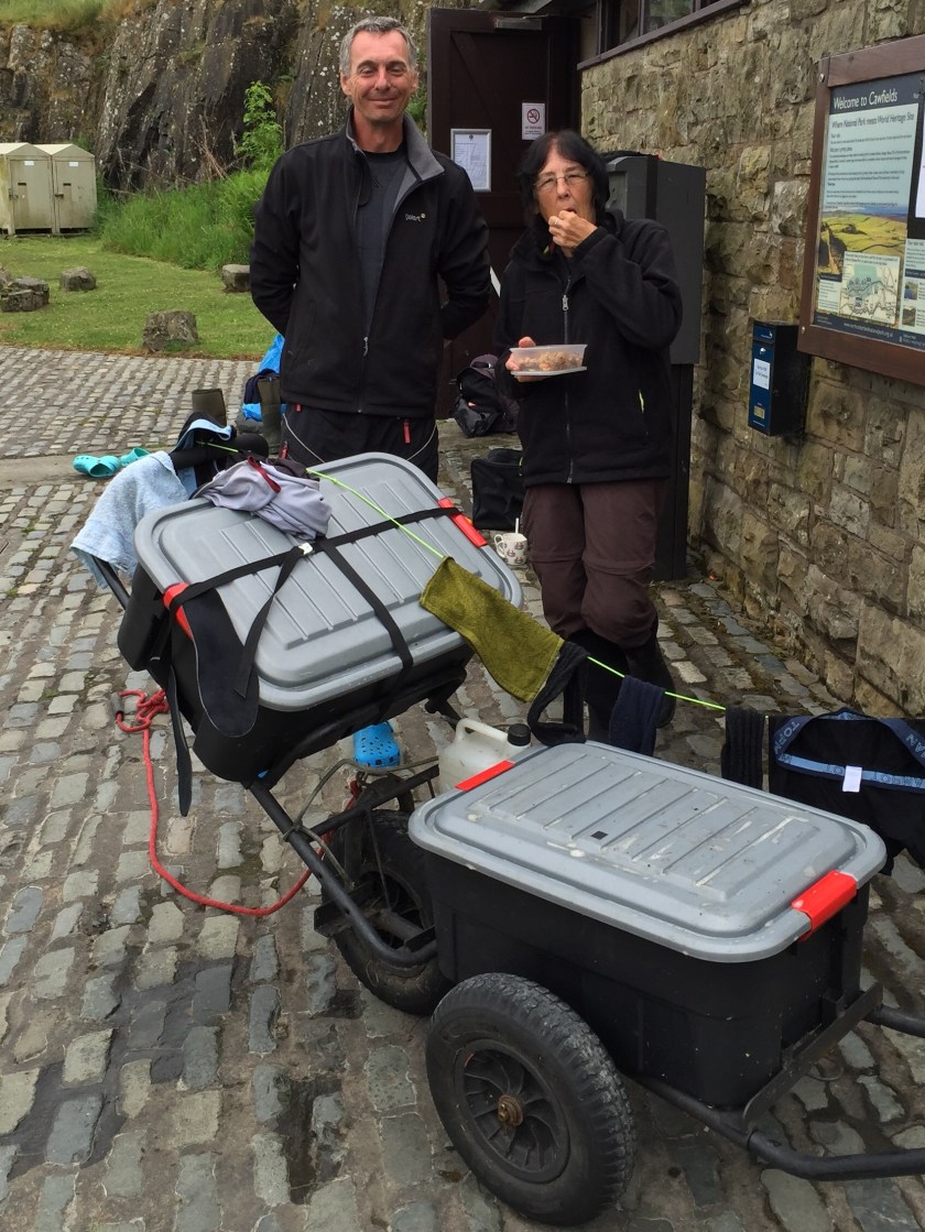 Having all but given up any hope of finding a solution to the load carrying dilemma Lynn was really exasperated when we came across Conal and Linda and……’Bob the Barrow’. Conal and Linda had planned to walk the Pennine Way, when Conal had first put his rucksack on he had said ‘forget this’ well he actually said something else a bit more Yorkshire. He came up with Bob a three wheeled collapsable barrow to carry all their kit. In addition to Bob they walked wearing steel toecapped wellies. We spent a good while discussing the advantages and disadvantages of Bob, for example negotiating stiles. Bob was fully equipped with two spare wheels. Conal and Linda would start walking each day at 5am, break midday to avoid the worst of the midday sun (if only) and then walk on until 10 pm and wild camp. We found them at a national park toilets making the most of all the amenities. Much to Lynn’s disgust it started Steve off thinking about his trolley design.