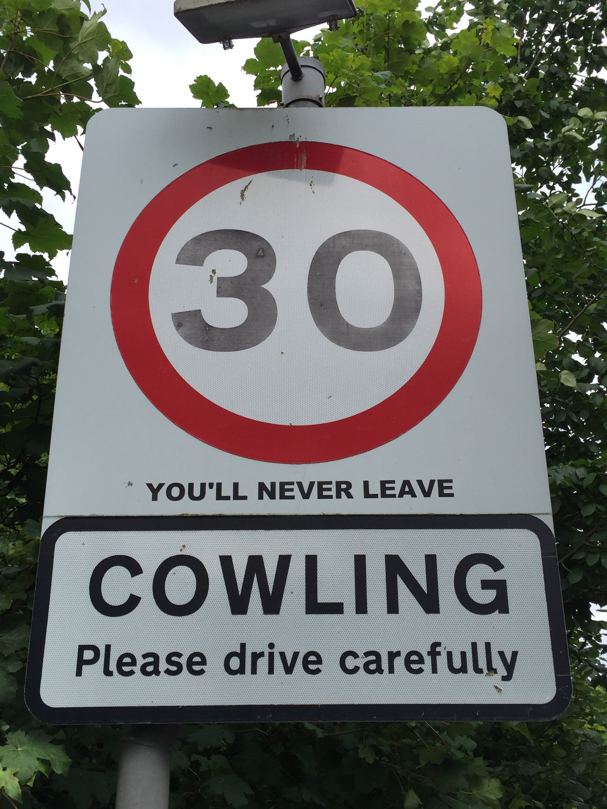 We hope to be leaving Cowley in the morning but are a little concerned about the sinister logo on the 30 mph speed limit sign we read on entering the town – or maybe it was all the talk of witchcraft that had spooked us.