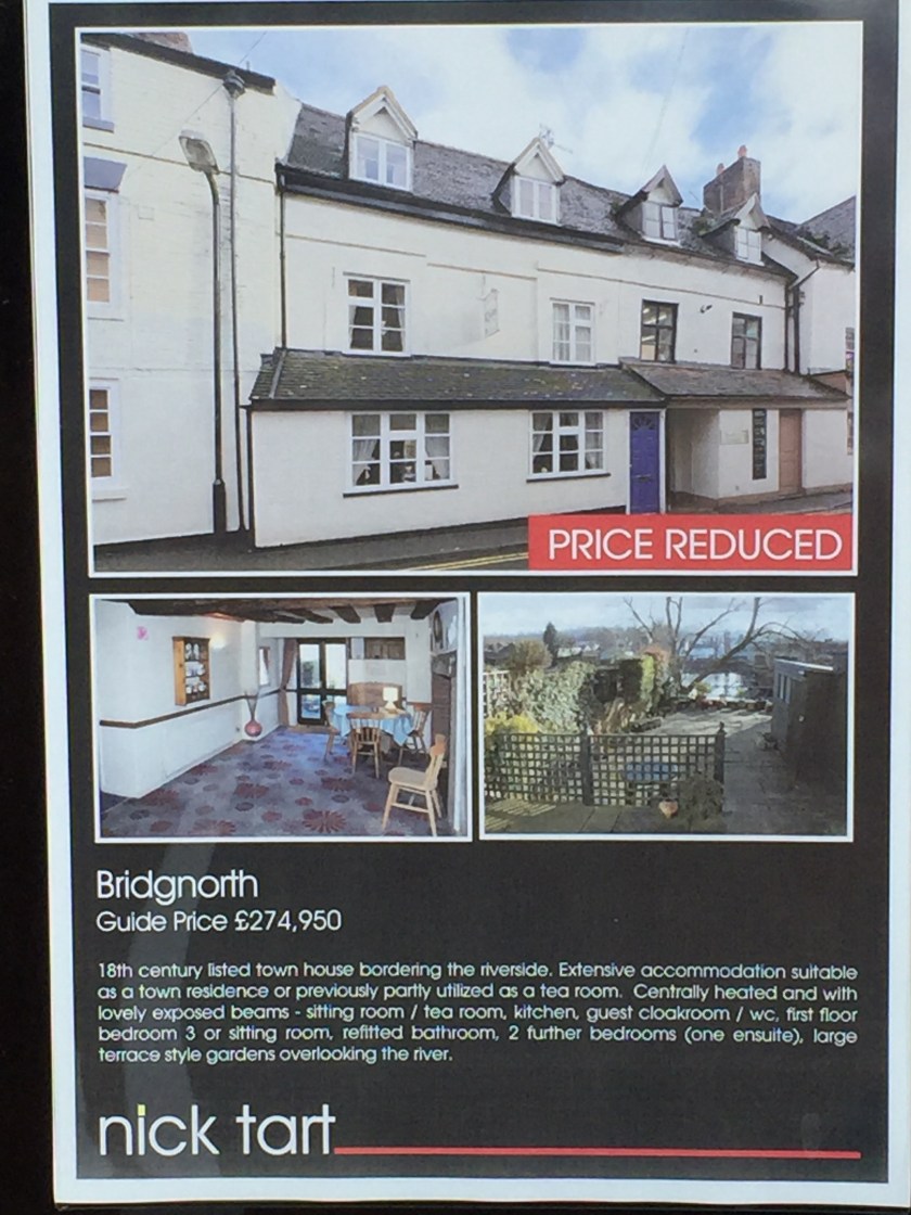 We were the only customers and the proprietors had only opened the tea shop a week ago and only at weekends. It transpired they were really only trying to improve their chances of selling the premises which was a listed 18th century riverside 3 bedroom town house which could have a tea room business run from the ground floor. The owner asked if we were interested in buying it. We didn’t so no and we didn’t say yes. We enjoyed our cream tea and the owner offered to let us leave our rucksacks with him while we climbed up to the higher part of Bridgnorth to get a few supplies. Bridgnorth has a funicular railway running from the riverside up to the town, we walked. It was just as well we had left the rucksacks behind as the town was busy with Sidmouth residents and we would have been knocking them over like skittles. For blog readers who do not know what characterises Sidmouth residents, the East Devon seaside town is often referred to as ‘God’s waiting room’. Having offended a good proportion of our readers we will move swiftly on, which is what we did but only as far as the Estate Agent’s window to check the asking price of the tea shop.