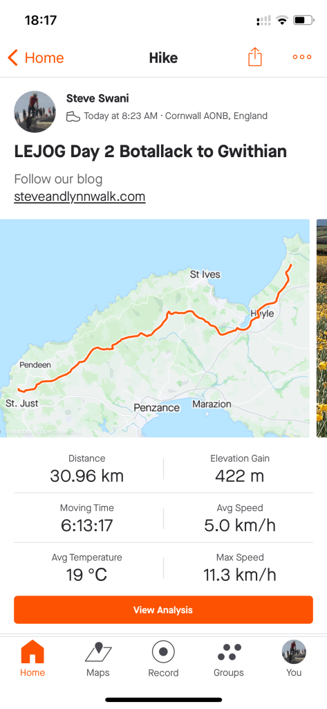 LEJOG 2022 Day 2 Botallack to Gwithian 19.24 miles cumulative 27.62