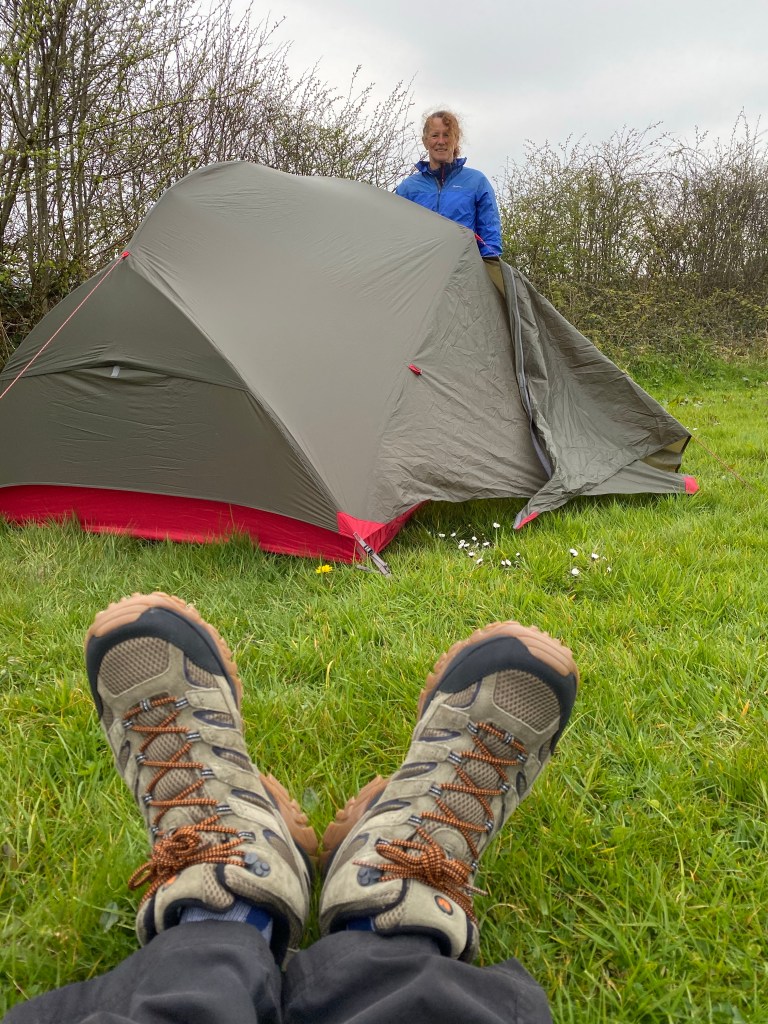 From Barnstaple a two mile climb to Brightlycott Farm campsite, where we are greeted by Charles. Although the site is not fully open yet this year, he will always accommodate walkers and cyclists. The sun has disappeared and it is a bit breezy at the hilltop site.