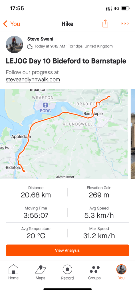 A night of chatting and laughter, a delicious home cooked meal and a cosy nights sleep. We started the day with a cooked breakfast to set us up for our stroll to Barnstaple. Thanks to Tony and Caroline.