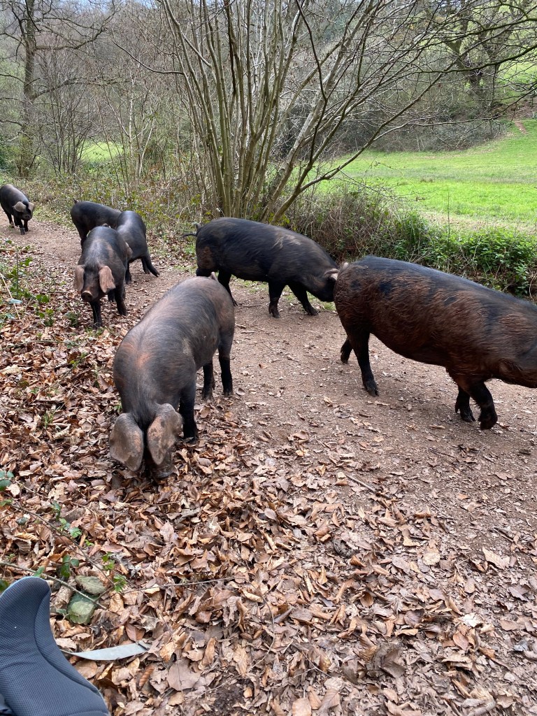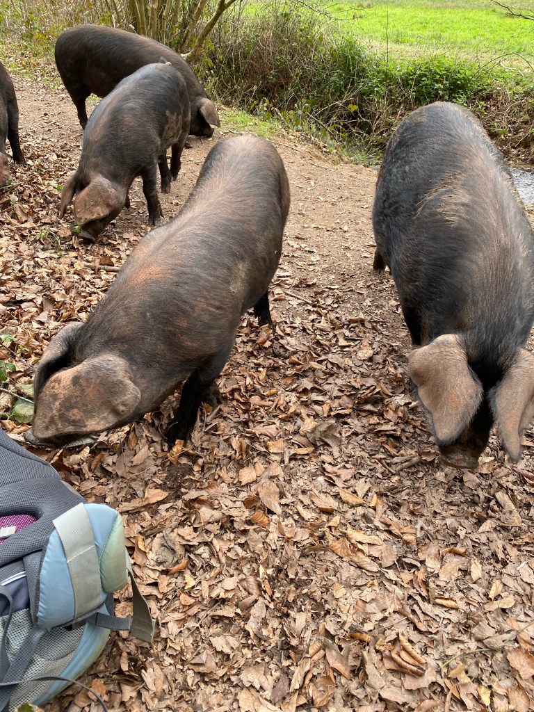 At our final break we were sat by the side of the track when up the path trotted 7 pigs. Steve grabbed his phone to take pictures and then had to encourage them away as one started to eat Lynn’s rucksack. While Steve was doing this Lynn had vanished, faster than Steve could say the ‘S’ of sausage rolls, over a stile, the fastest she had moved in a long time. Apparently she is permanently traumatised after being chased by pigs as a young child.