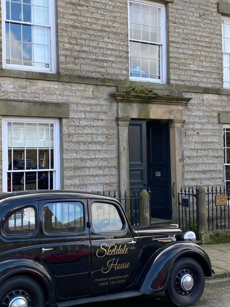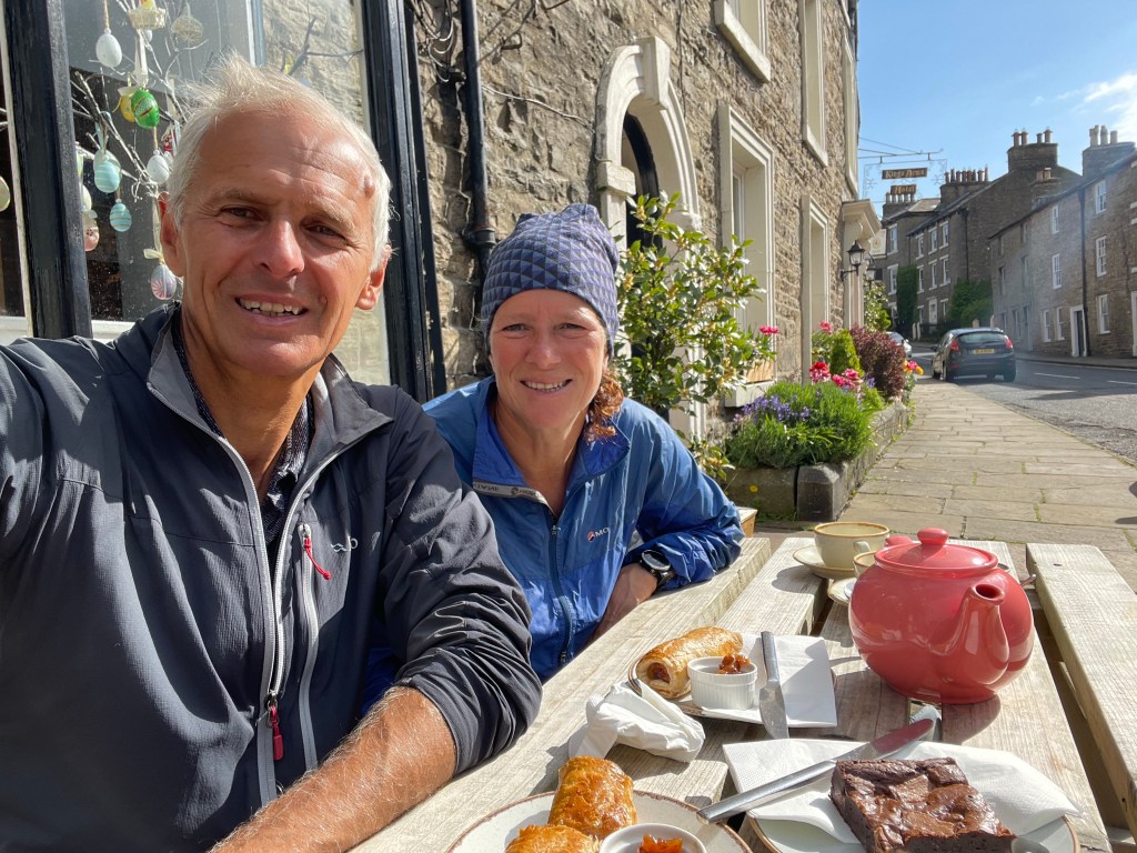 We started out along the River Ure which takes us up Wensleydale to the picturesque village of Askrigg and breakfast at ‘The Bake Well’, to make up for the one we didn’t get at the George and Dragon. We sat outside in the sunshine enjoying Yorkshire tea, a sausage roll and a Mars Bar Brownie sat opposite Skeldale house, a location used in ‘All Creatures Great and Small’, now upmarket luxury accommodation.