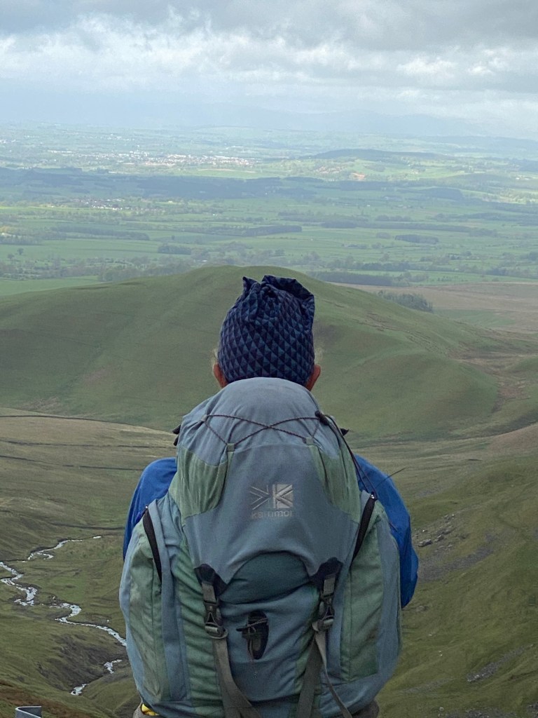 We started with a 9km climb out of Dufton, to Knock Fell firstly on paths and later on a track which had been tarmacked. Fortunately the cloud base wasn’t too low so we had fantastic views back to western Cumbria.