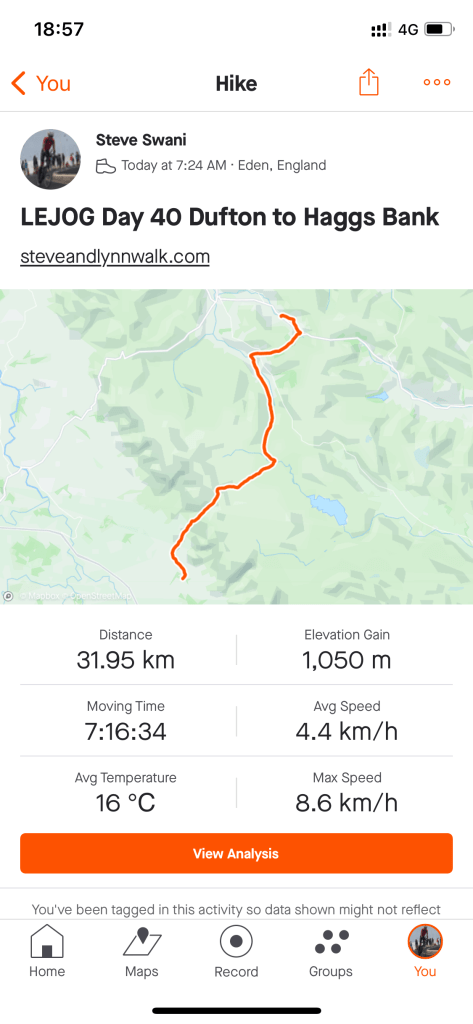 One thought on “LEJOG Day 40 – Dufton to Haggs Bank 19.85 miles. Cumulative 721.07 miles”