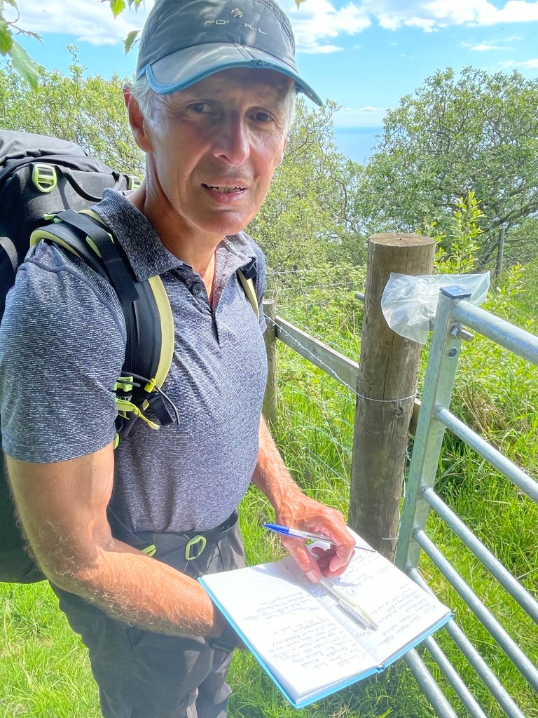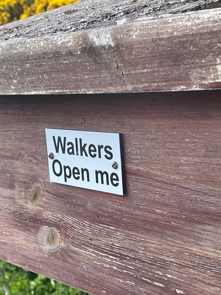 We passed a wooden box on a post labelled ‘walkers please open’. We gingerly opened it up expecting it to explode but it just contained an invitation from the trail charity to sign a book detailing our walk and leave comments and contact details. We entered details and had a quick look at previous entries. A southbound end to ender had signed it three days previously.