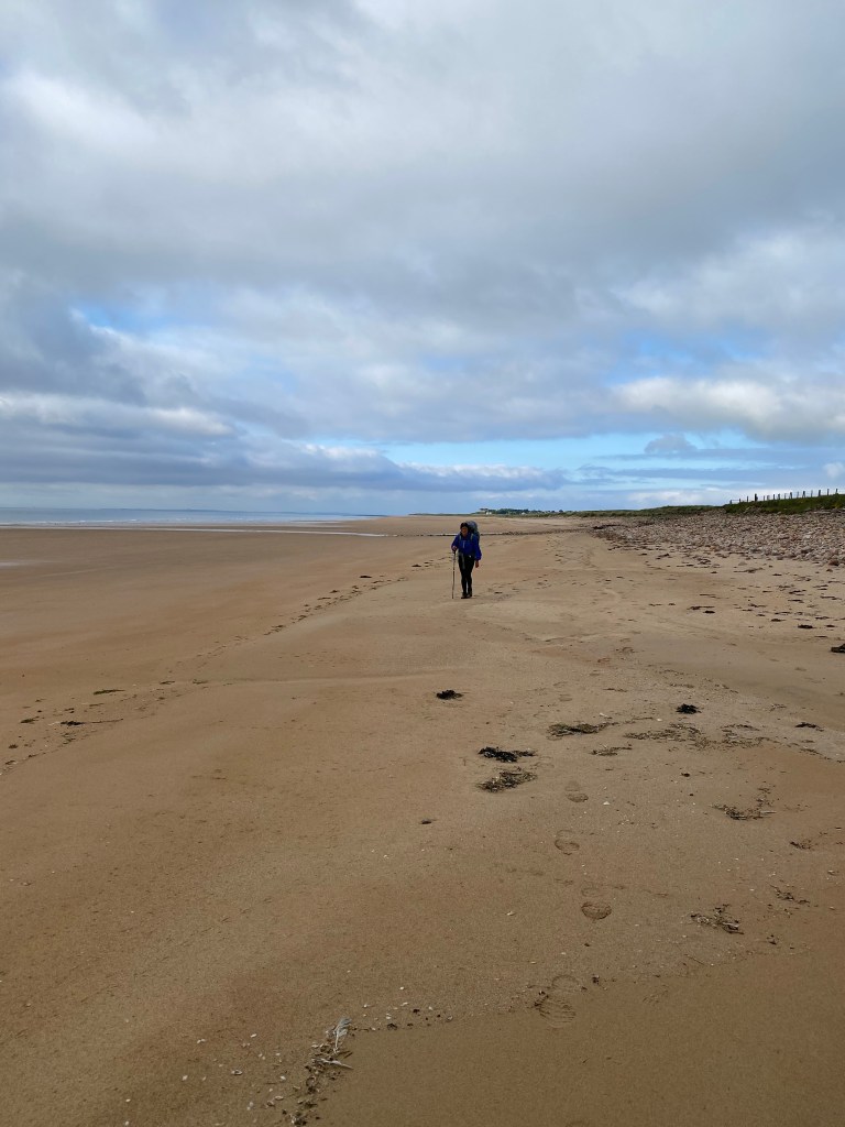 After the village of Ackergillshore, we joined the beach. We had timed the walk perfectly to coincide with low tide to avoid walking the path through the massive sand dunes that back the beach and also to ford a river half way along which can be waist deep when the river is in spate and the tide is high. We arrived at the river spot on low tide and managed to cross it without even removing our boots.