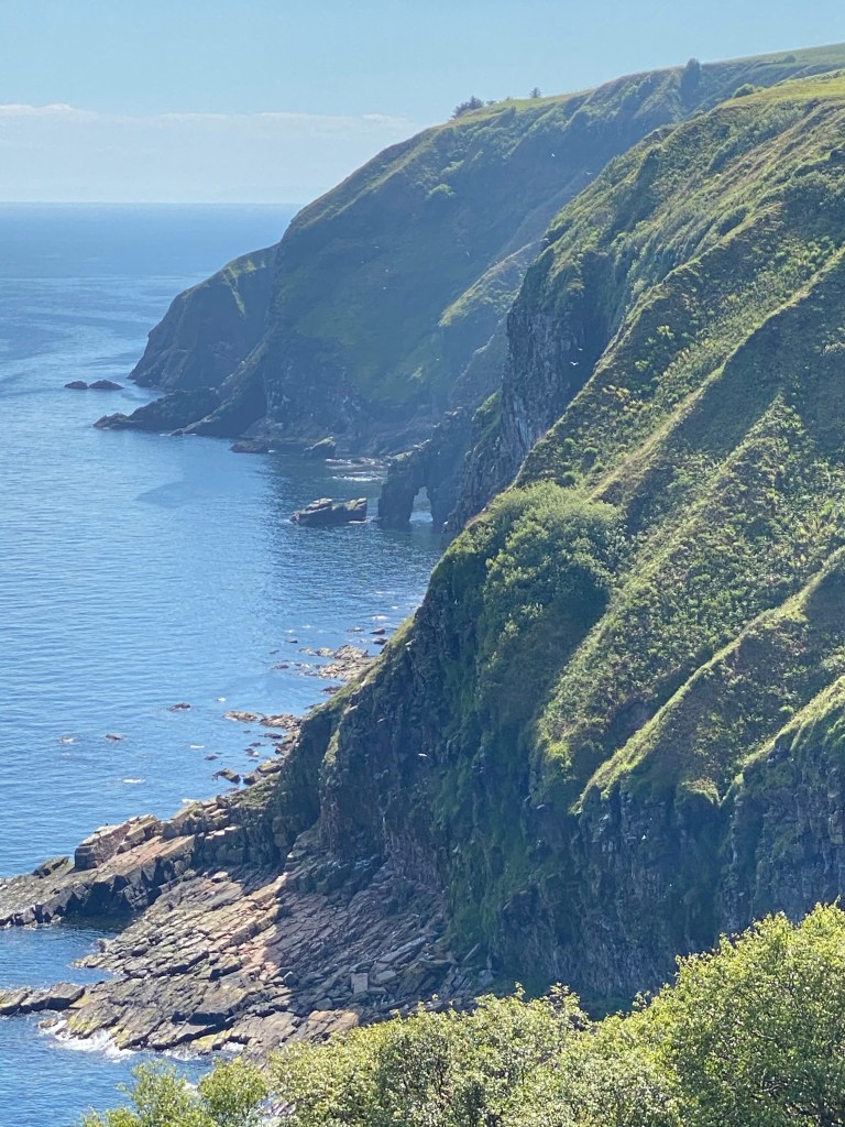 After a good lunch at The River Bothy Tea Rooms in Berridale, we set out for the walk to Dunbeath, also described as rough coastal walking. The going was a lot tougher afternoon, the ferns and grass must have put on a growth spurt on while we were having lunch. In addition to the thick undergrowth there were some tricky sections of path squeezed between the stone wall and the cliff edge, not great if you haven’t got a head for heights like Lynn, still it took her mind off looking for adders for a while.