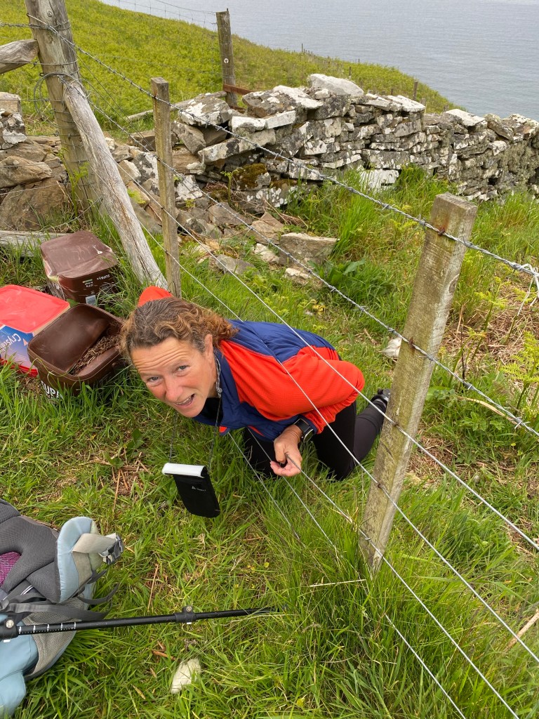Things went downhill from here, the path squeezed between a fence and the cliff edge was extremely narrow and dangerous in places, the guide suggested walking inside the fence, which we did. Unfortunately, this meant crossing numerous barbed wire fences with no stiles, sometimes over, sometimes under the fence, impossible with backpacks, so these had to be taken off and passed over the fence or even thrown over.