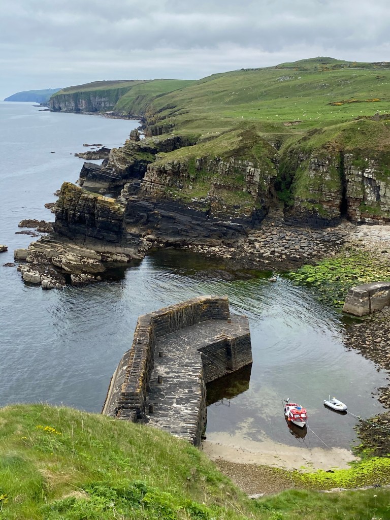 We started out southbound back to Dunbeath harbour and the start of the coast path. In the harbour is Neil Gunn’s statue of Kenn, a nine year old boy and central character in his book ‘Highland River’, who caught a salmon with his bare hands.