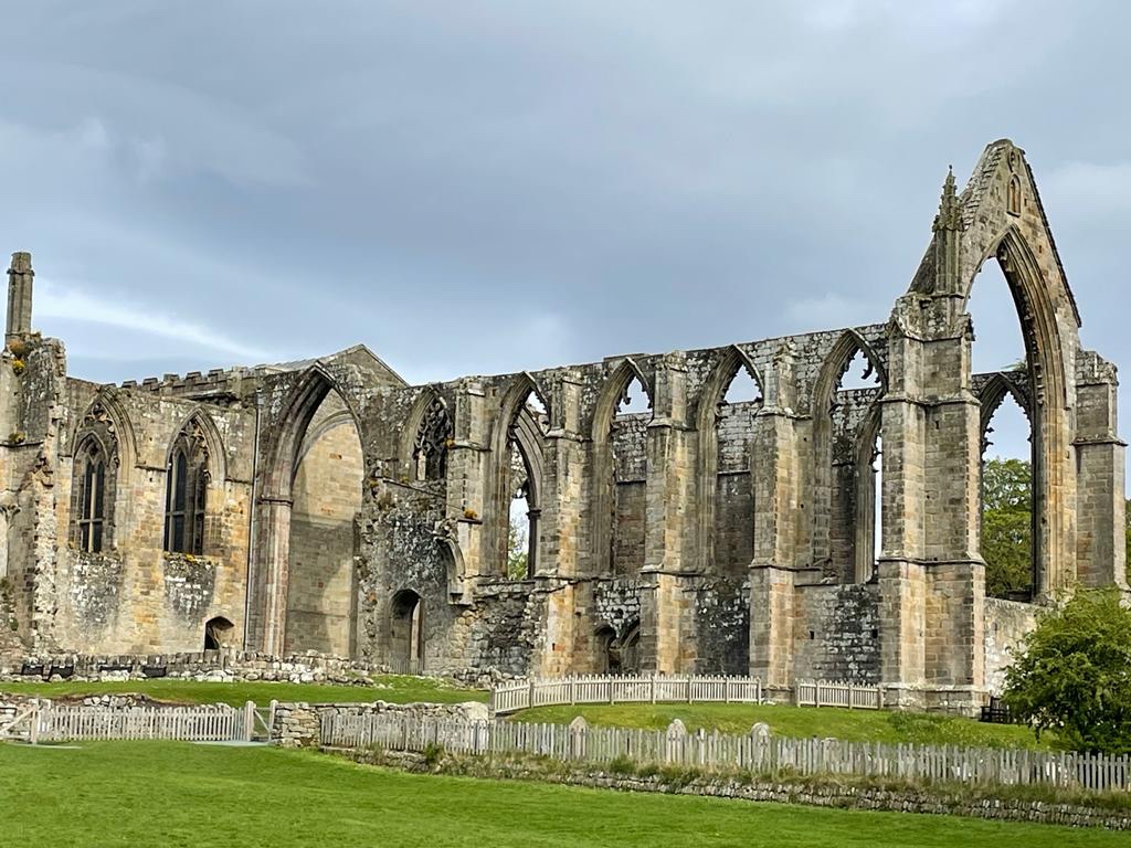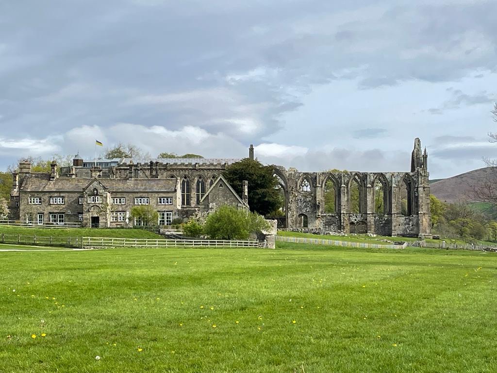 We started out along the River Ure which takes us up Wensleydale to the picturesque village of Askrigg and breakfast at ‘The Bake Well’, to make up for the one we didn’t get at the George and Dragon. We sat outside in the sunshine enjoying Yorkshire tea, a sausage roll and a Mars Bar Brownie sat opposite Skeldale house, a location used in ‘All Creatures Great and Small’, now upmarket luxury accommodation.